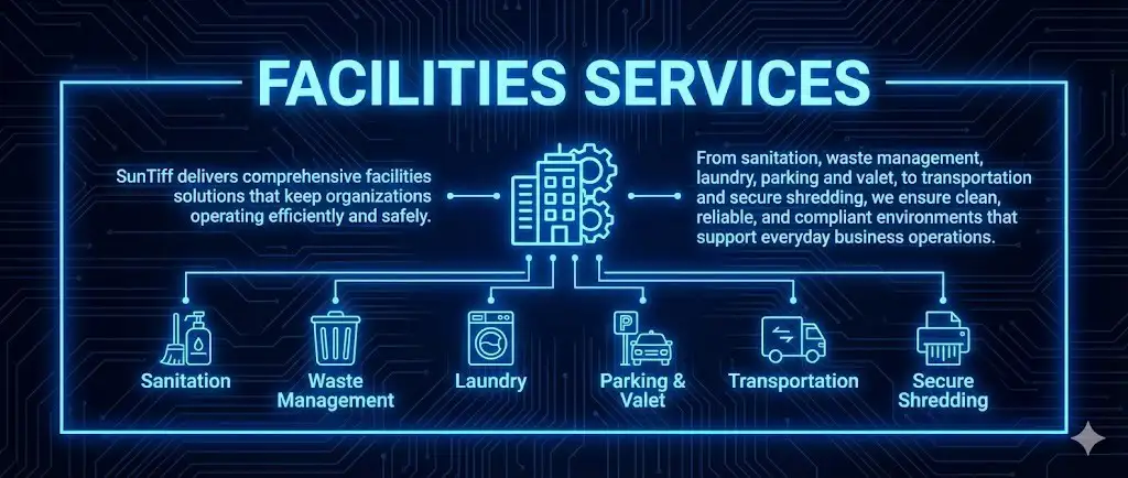 SunTiff delivers comprehensive facilities solutions that keep organizations operating efficiently and safely. From sanitation, waste management, laundry, parking and valet, to transportation and secure shredding, we ensure clean, reliable, and compliant environments that support everyday business operations.